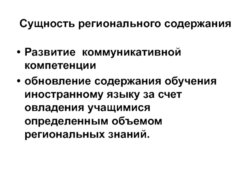 Сущность регионального содержанияРазвитие коммуникативной компетенции обновление содержания обучения иностранному языку за счет овладения учащимися определенным объемом региональных
