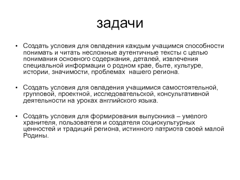 задачиСоздать условия для овладения каждым учащимся способности понимать и читать несложные аутентичные тексты с целью понимания основного