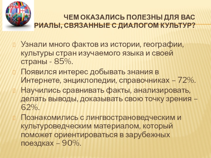 Узнали много фактов из истории, географии, культуры стран изучаемого языка и своей страны - 85%.
