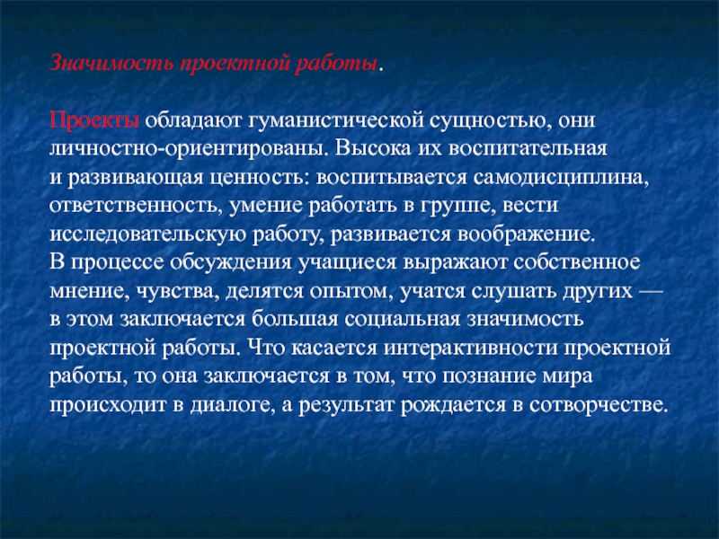 и развивающая ценность: воспитывается самодисциплина, ответственность, умение работать в группе, вести исследовательскую работу, развивается воображение. В процессе обсуждения учащиеся выражают собственное мнение, чувства, делятся опытом, учатся слушать других — в этом заключается большая социальная значимость проектной работы. Что касается интерактивности проектной работы, то она заключается в том, что познание мира происходит в диалоге, а результат рождается в сотворчестве.