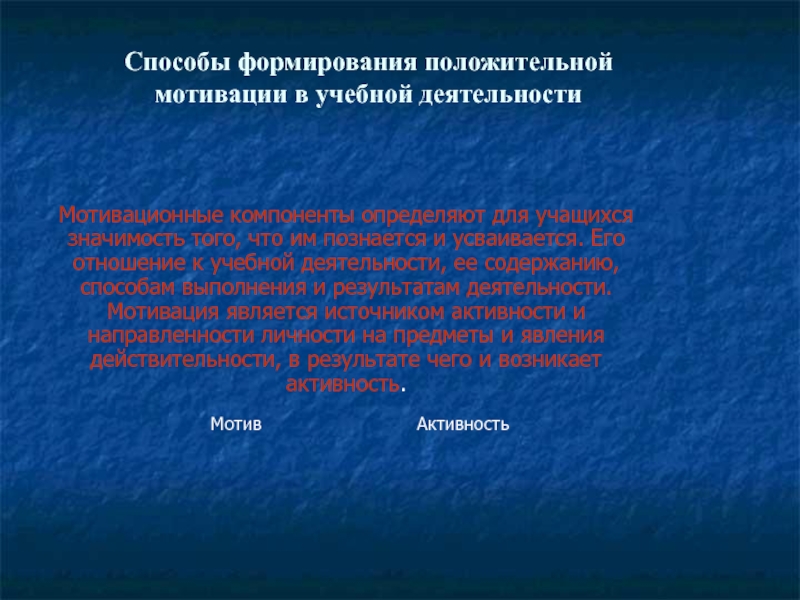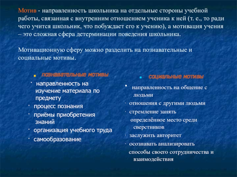 Слайд 3Мотив - направленность школьника на отдельные стороны учебной работы, связанная с