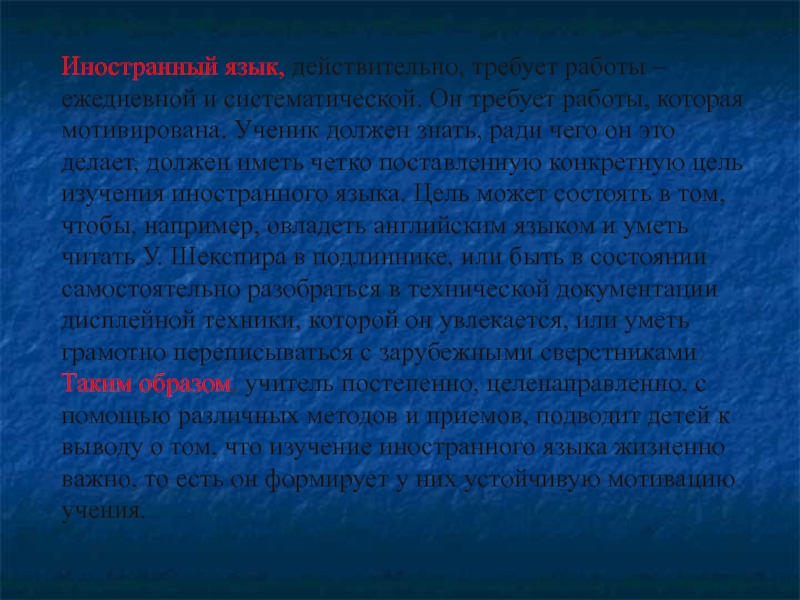 работы, которая мотивирована. Ученик должен знать, ради чего он это делает, должен иметь четко поставленную конкретную цель изучения иностранного языка. Цель может состоять в том, чтобы, например, овладеть английским языком и уметь читать У. Шекспира в подлиннике, или быть в состоянии самостоятельно разобраться в технической документации дисплейной техники, которой он увлекается, или уметь грамотно переписываться с зарубежными сверстниками. Таким образом, учитель постепенно, целенаправленно, с помощью различных методов и приемов, подводит детей к выводу о том, что изучение иностранного языка жизненно важно, то есть он формирует у них устойчивую мотивацию учения.