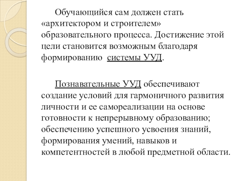 строителем» образовательного процесса. Достижение этой цели становится возможным благодаря формированию системы УУД.