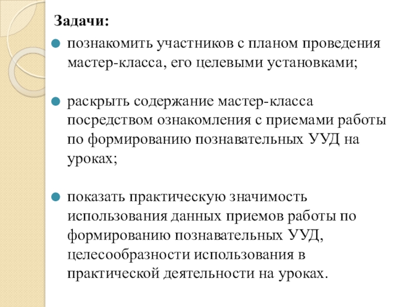 познакомить участников с планом проведения мастер-класса, его целевыми установками;