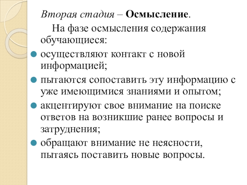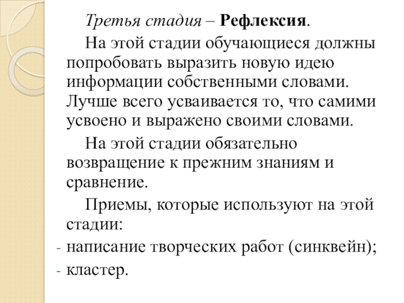 На этой стадии обучающиеся должны попробовать выразить новую идею информации собственными словами. Лучше всего усваивается то, что самими усвоено и выражено своими словами.