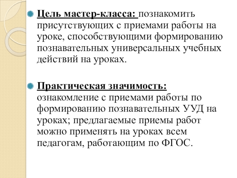 Слайд 2Цель мастер-класса: познакомить присутствующих с приемами работы на уроке, способствующими формированию
