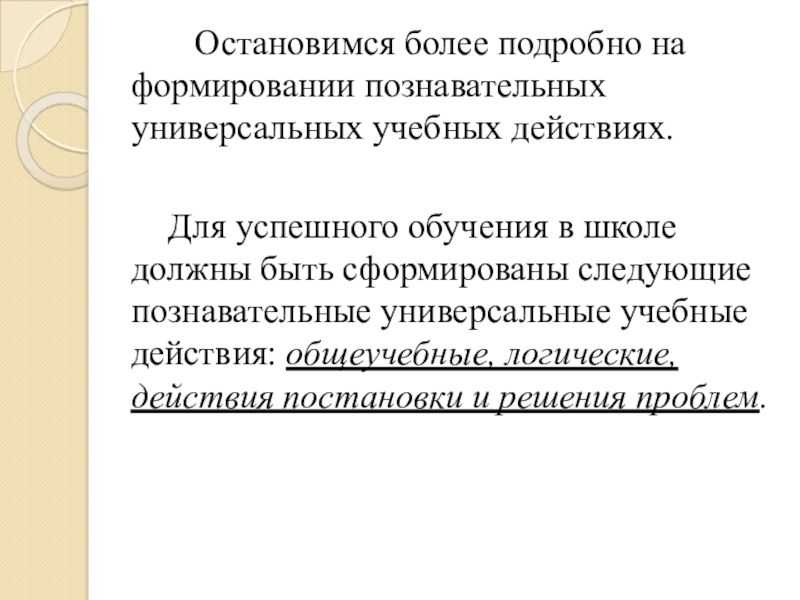Для успешного обучения в школе должны быть сформированы следующие познавательные универсальные учебные действия: общеучебные, логические, действия постановки и решения проблем.