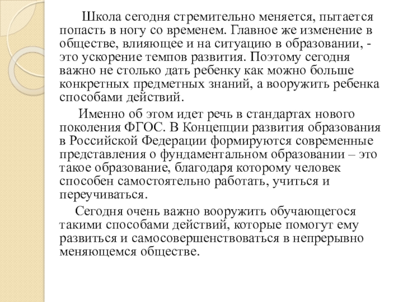 в ногу со временем. Главное же изменение в обществе, влияющее и на ситуацию в образовании, - это ускорение темпов развития. Поэтому сегодня важно не столько дать ребенку как можно больше конкретных предметных знаний, а вооружить ребенка способами действий.
