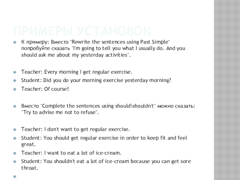 К примеру: Вместо "Rewrite the sentences using Past Simple" попробуйте