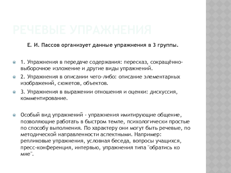 Е. И. Пассов организует данные упражнения в 3 группы.