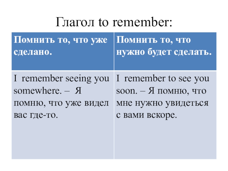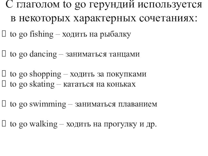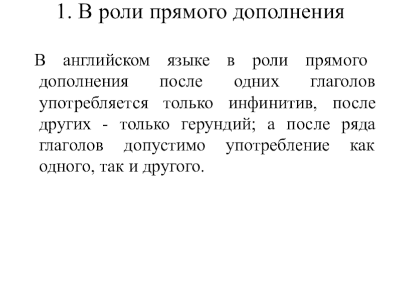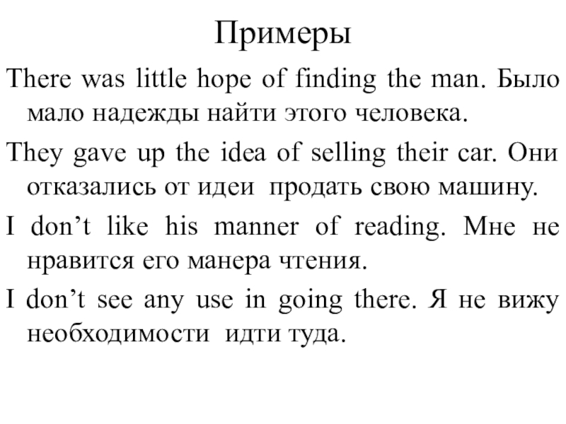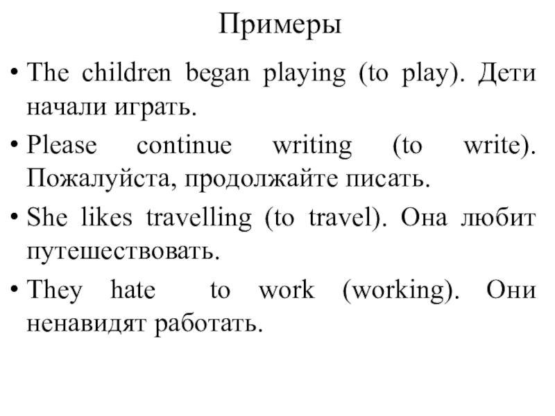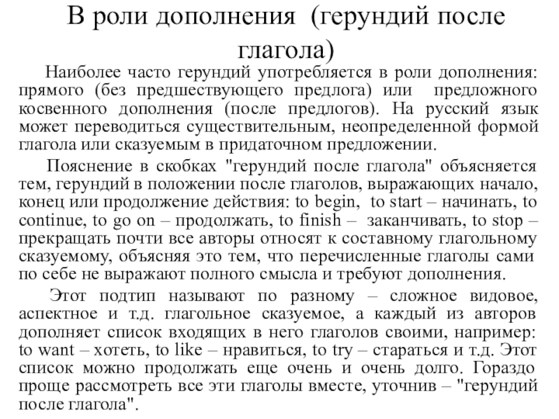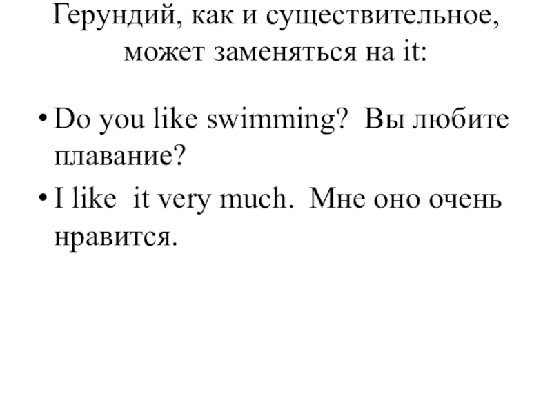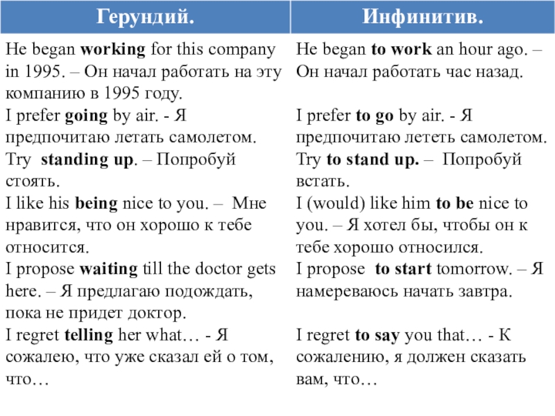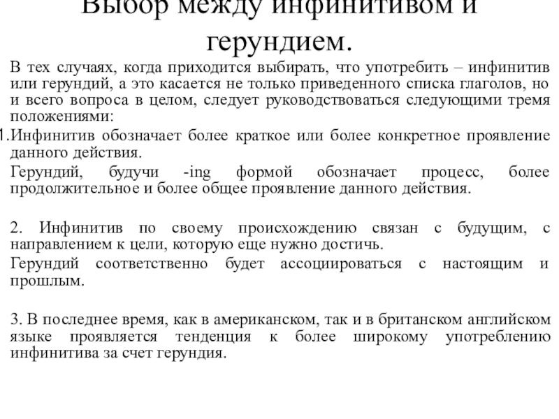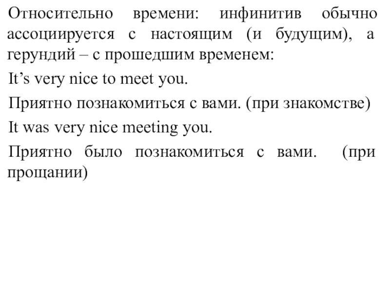 факторов. Например, при употреблении инфинитива речь идет о более общих фактах и положениях, а при употреблении герундия - о более конкретных, знакомых собеседнику, фактах. Поэтому герундий обычно сопровождается дополнениями или обстоятельствами, конкретизирующими ситуацию (или она ясна из контекста):
