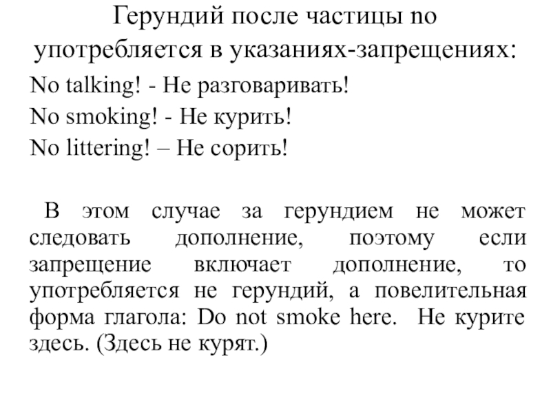 В этом случае за герундием не может следовать дополнение, поэтому если запрещение включает дополнение, то употребляется не герундий, а повелительная форма глагола: Do not smoke here. Не курите здесь. (Здесь не курят.)