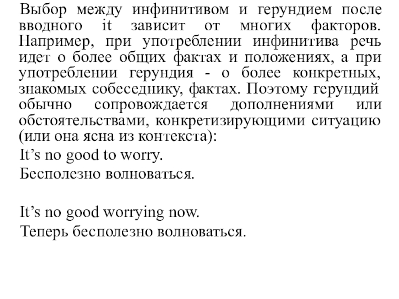 Слайд 10Выбор между инфинитивом и герундием после вводного it зависит от многих
