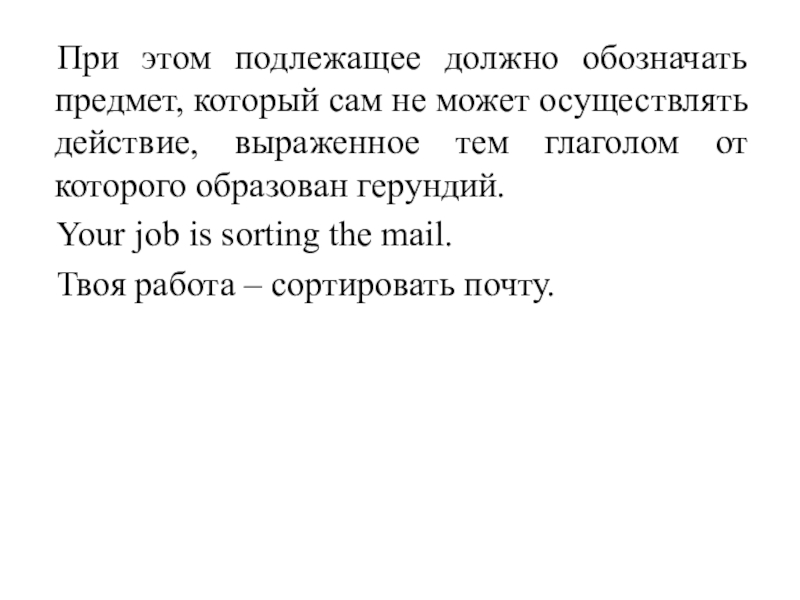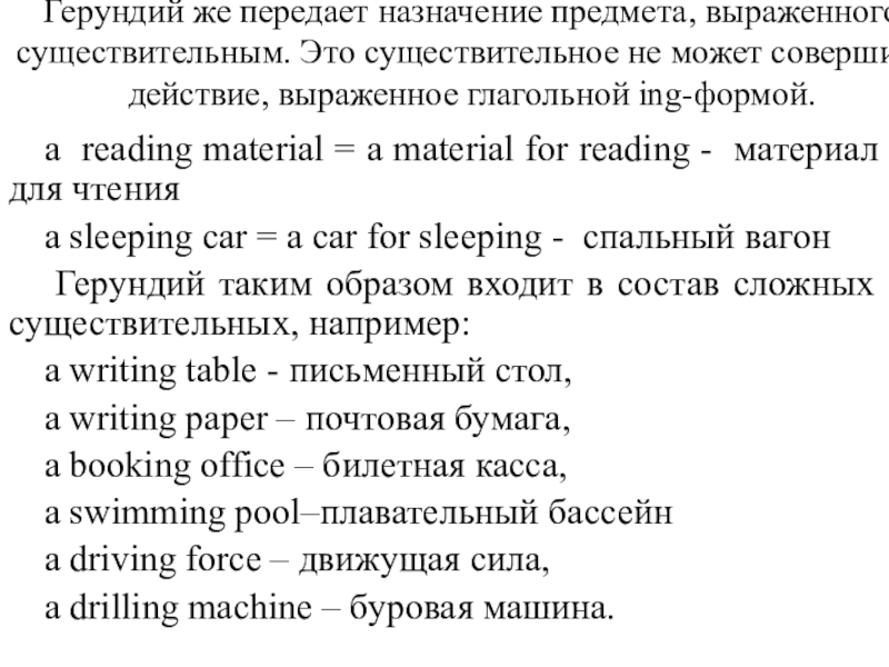 Слайд 42Герундий же передает назначение предмета, выраженного существительным. Это существительное не может