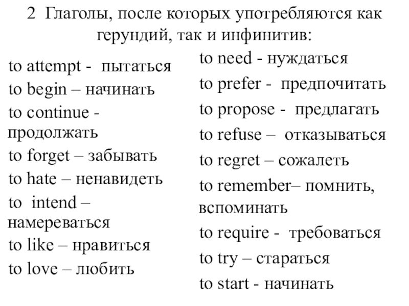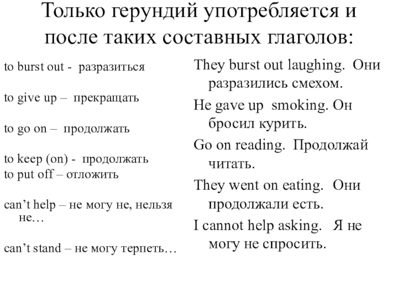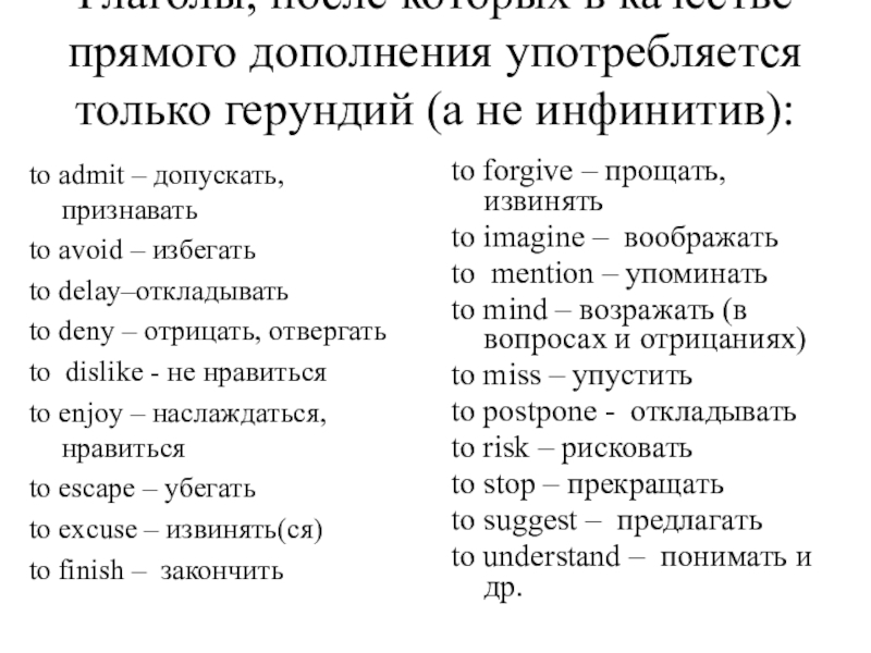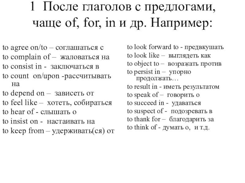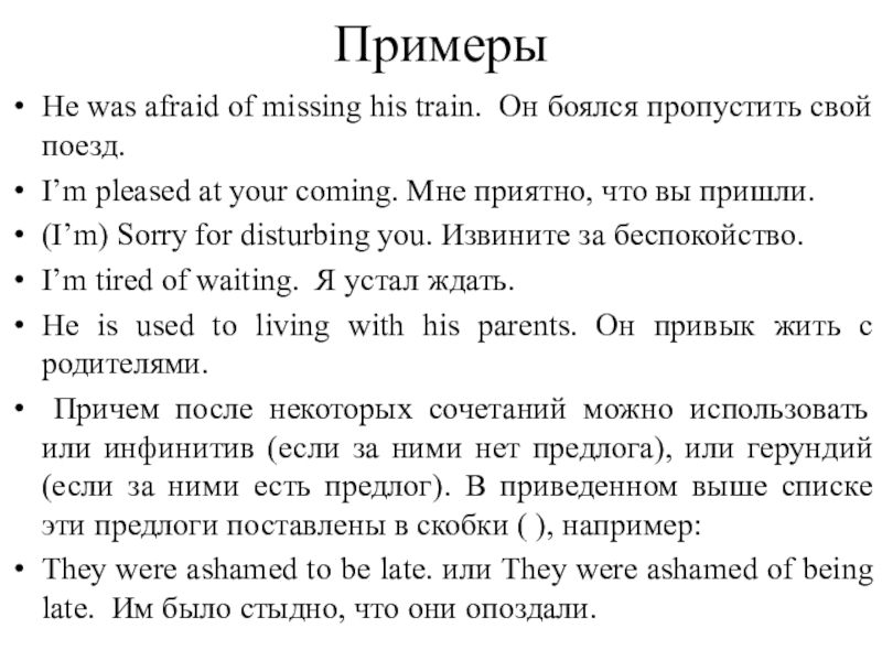 Причем после некоторых сочетаний можно использовать или инфинитив (если за ними нет предлога), или герундий (если за ними есть предлог). В приведенном выше списке эти предлоги поставлены в скобки ( ), например: