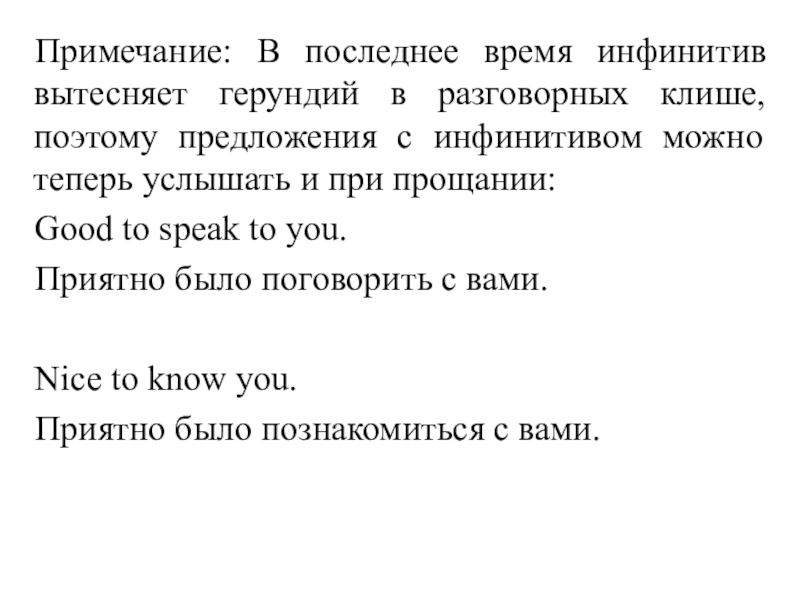 Слайд 13Примечание: В последнее время инфинитив вытесняет герундий в разговорных клише, поэтому