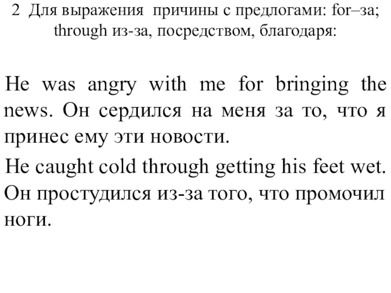 Слайд 442 Для выражения причины с предлогами: for–за; through из-за, посредством, благодаря: