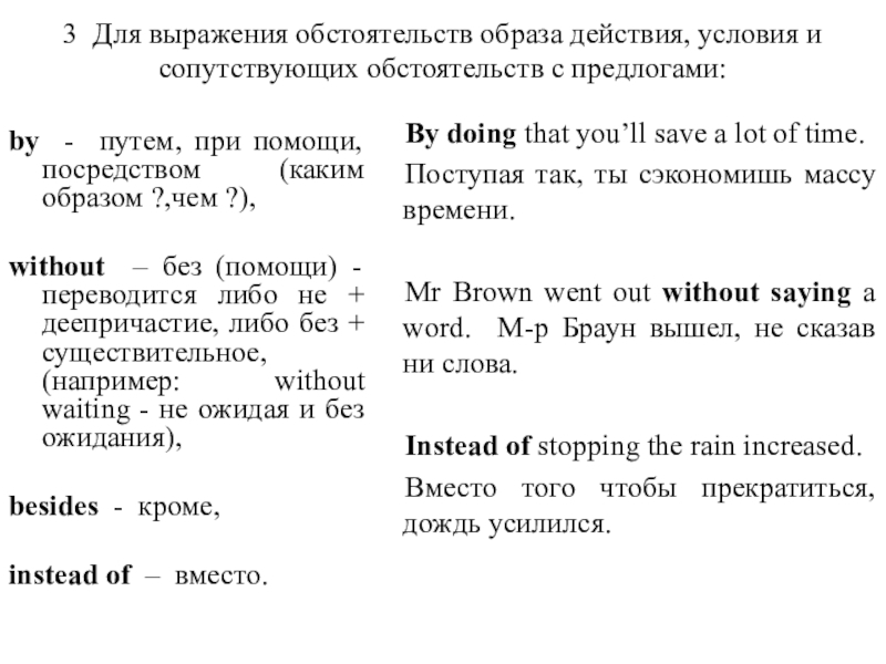 Слайд 453 Для выражения обстоятельств образа действия, условия и сопутствующих обстоятельств с