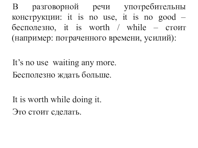 Слайд 9В разговорной речи употребительны конструкции: it is no use, it is