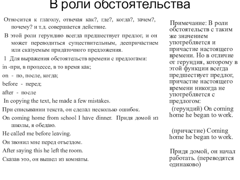 Примечание: В роли обстоятельств с таким же значением употребляется и причастие настоящего времени. Но в отличие от герундия, которому в этой функции всегда предшествует предлог, причастие настоящего времени никогда не употребляется с предлогом: