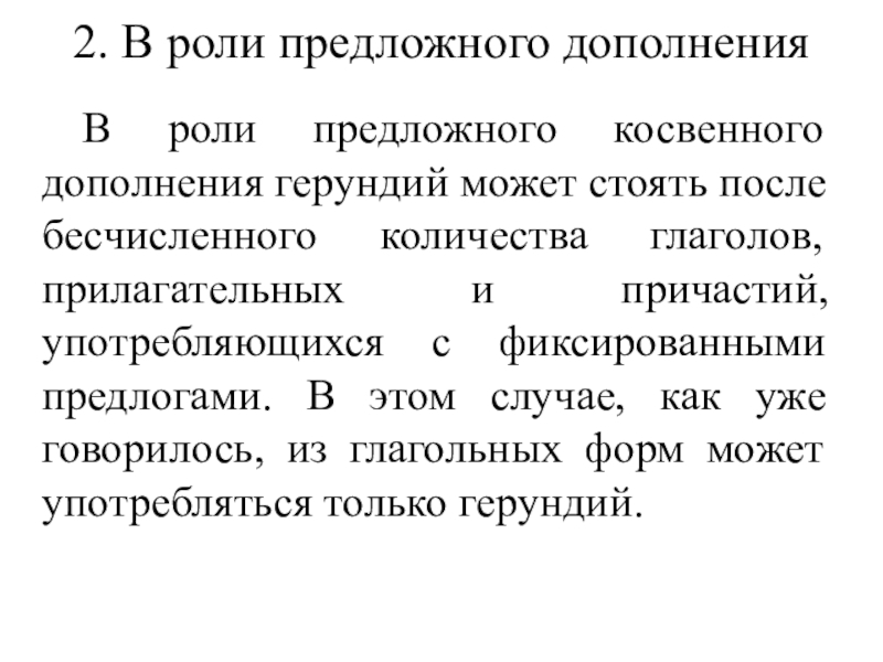 В этой роли герундию всегда предшествует предлог, и он может переводиться существительным, деепричастием или сказуемым придаточного предложения.