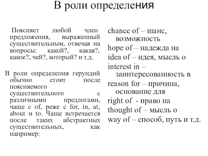 В роли определения герундий обычно стоит после поясняемого существительного с различными предлогами, чаще с of, реже с for, in, at, about и to. Чаще встречается после таких абстрактных существительных, как например: