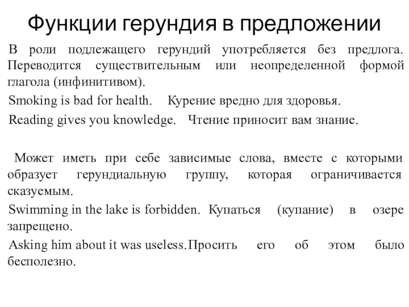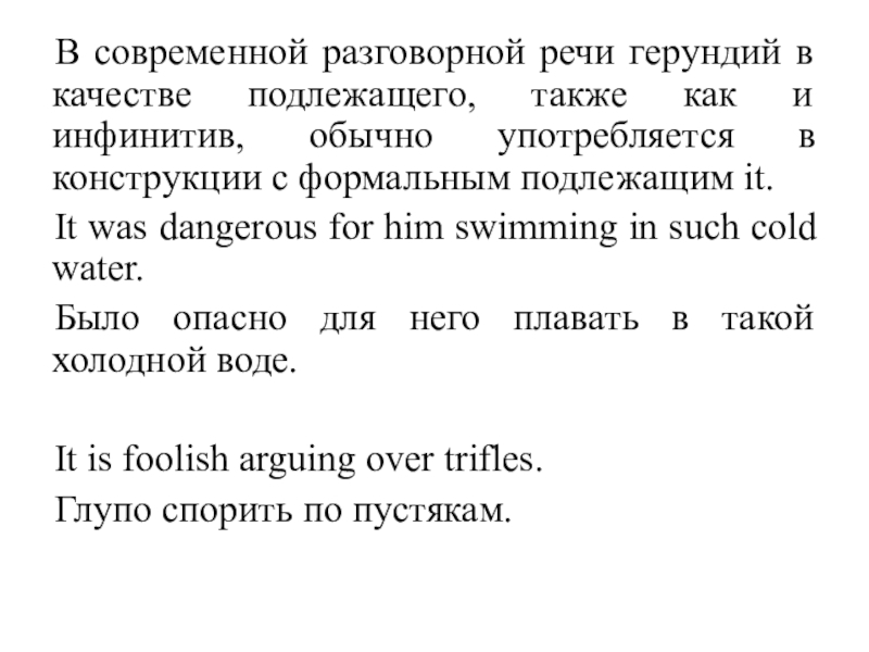 Слайд 8В современной разговорной речи герундий в качестве подлежащего, также как и