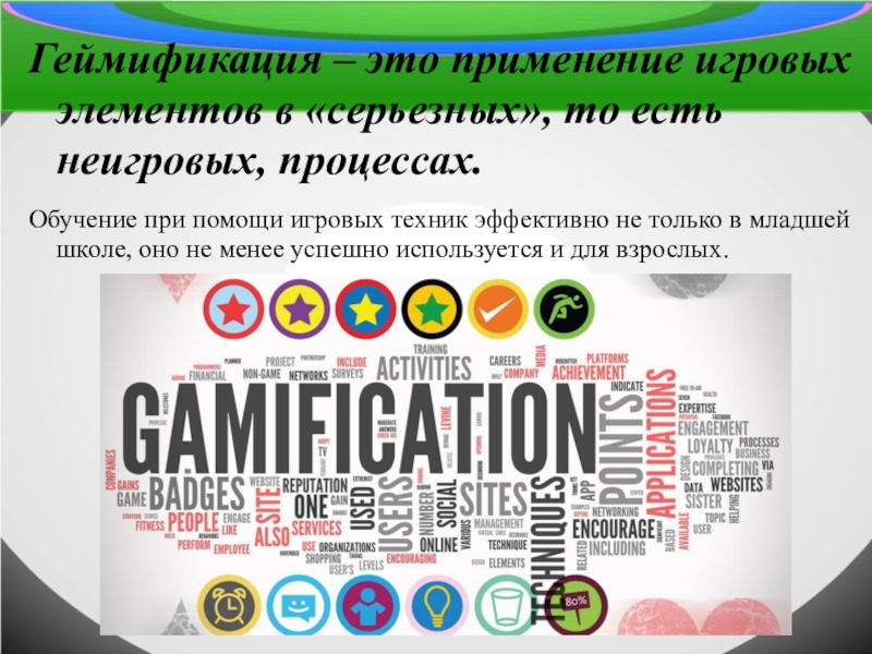 Геймификация – это применение игровых элементов в «серьезных», то есть неигровых, процессах.Обучение при помощи игровых техник эффективно не только в младшей школе, оно не менее успешно используется и для взрослых.