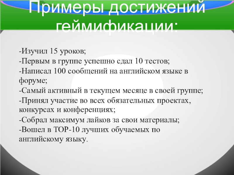 Примеры достижений геймификации:-Изучил 15 уроков;-Первым в группе успешно сдал 10 тестов;-Написал 100 сообщений на английском языке в