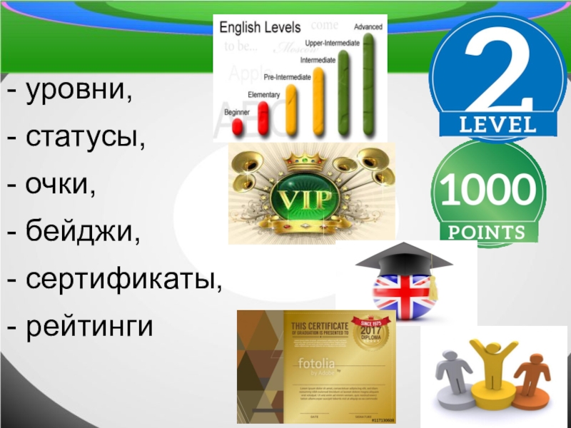 - уровни,- статусы,- очки,- бейджи,- сертификаты,- рейтинги