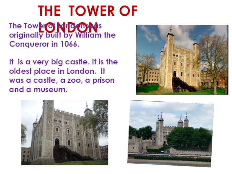 It is a very big castle. It is the oldest place in London. It was a castle, a zoo, a prison and a museum.