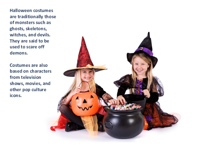Слайд 7Halloween costumes are traditionally those of monsters such as ghosts, skeletons,