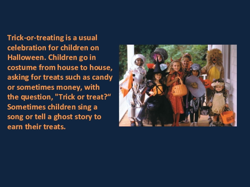 Слайд 18Trick-or-treating is a usual celebration for children on Halloween. Children go