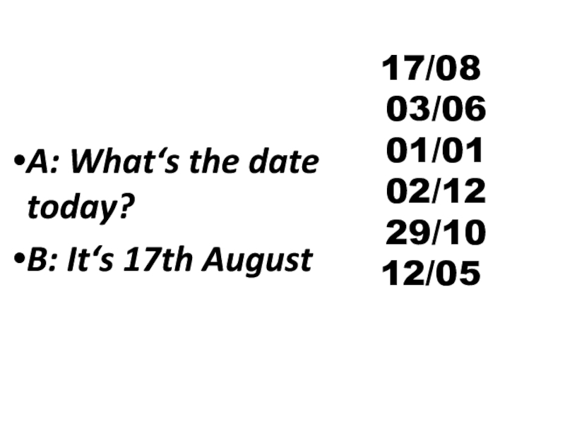 17/08  03/06  01/01  02/12  29/10  12/05A: What‘s the date today?B: It‘s 17th
