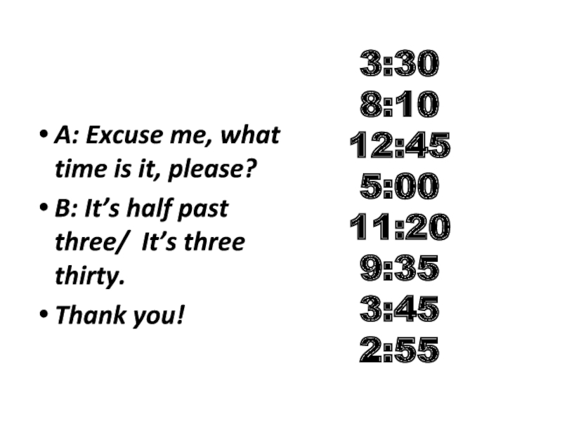 3:30 8:10 12:45 5:00 11:20 9:35 3:45 2:55A: Excuse me, what time is it, please?B: It’s half