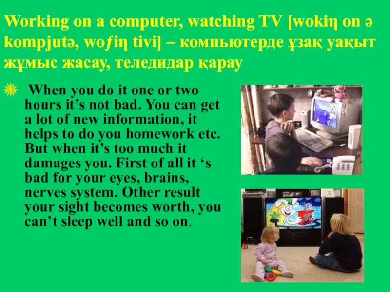 When you do it one or two hours it’s not bad. You can get a lot of new information, it helps to do you homework etc. But when it’s too much it damages you. First of all it ‘s bad for your eyes, brains, nerves system. Other result your sight becomes worth, you can’t sleep well and so on.