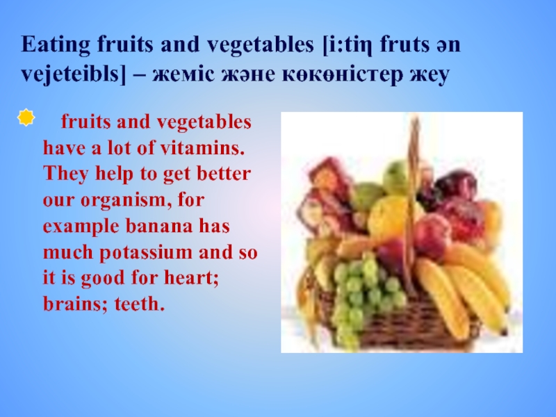 fruits and vegetables have a lot of vitamins. They help to get better our organism, for example banana has much potassium and so it is good for heart; brains; teeth.