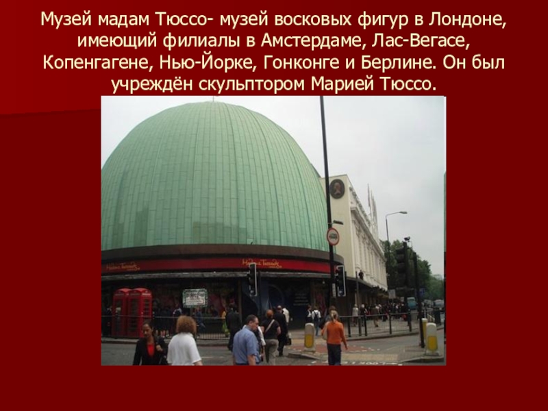 Слайд 48Музей мадам Тюссо- музей восковых фигур в Лондоне, имеющий филиалы в