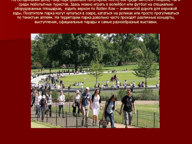 так и среди любопытных туристов. Здесь можно играть в волейбол или футбол на специально оборудованных площадках, ездить верхом по Rotten Row – знаменитой дороге для верховой езды. Посетители парка могут купаться в озере, кататься на роликах или просто прогуливаться по тенистым аллеям. На территории парка довольно часто проходят различные концерты, выступления, официальные парады и самые разнообразные выставки.