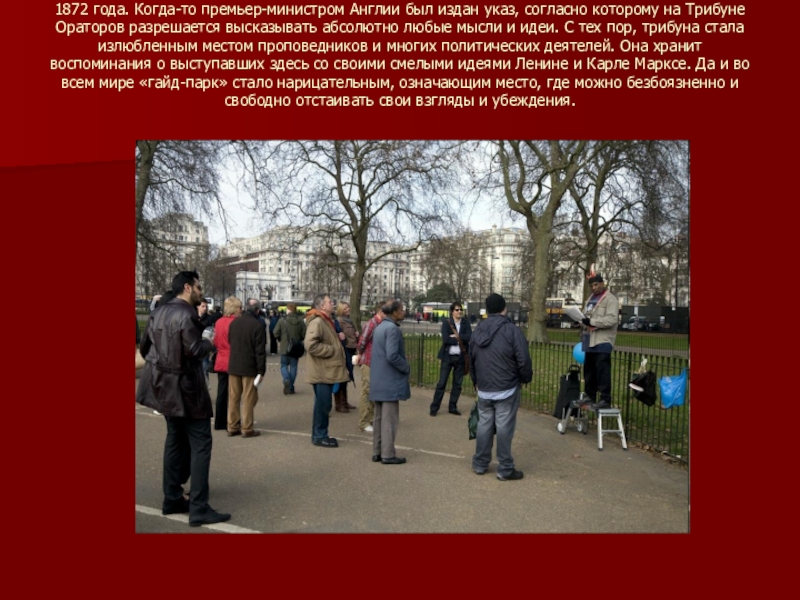 с 1872 года. Когда-то премьер-министром Англии был издан указ, согласно которому на Трибуне Ораторов разрешается высказывать абсолютно любые мысли и идеи. С тех пор, трибуна стала излюбленным местом проповедников и многих политических деятелей. Она хранит воспоминания о выступавших здесь со своими смелыми идеями Ленине и Карле Марксе. Да и во всем мире «гайд-парк» стало нарицательным, означающим место, где можно безбоязненно и свободно отстаивать свои взгляды и убеждения.