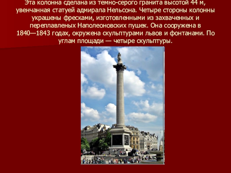 адмирала Нельсона. Четыре стороны колонны украшены фресками, изготовленными из захваченных и переплавленых Наполеоновских пушек. Она сооружена в 1840—1843 годах, окружена скульптурами львов и фонтанами. По углам площади — четыре скульптуры.