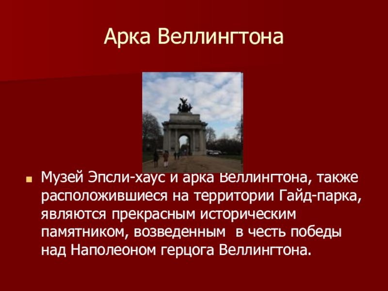 Музей Эпсли-хаус и арка Веллингтона, также расположившиеся на территории Гайд-парка,