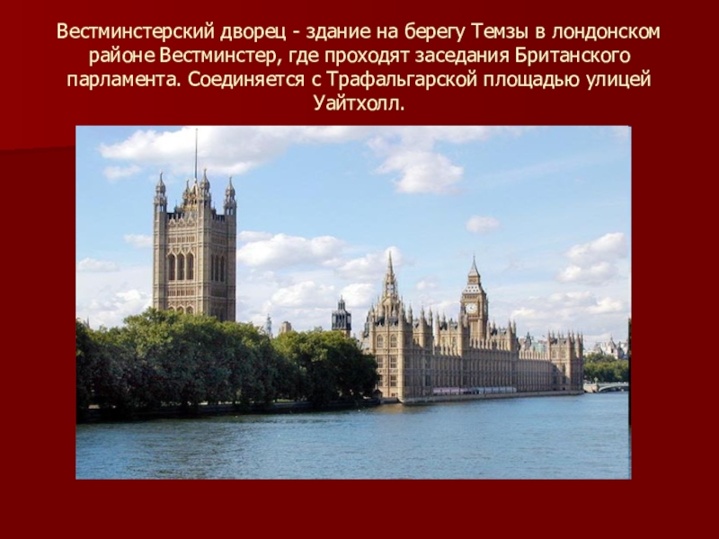 Слайд 36Вестминстерский дворец - здание на берегу Темзы в лондонском районе Вестминстер,