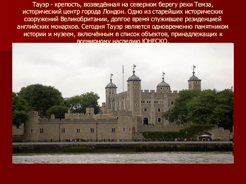 Слайд 29Тауэр - крепость, возведённая на северном берегу реки Темза, исторический центр
