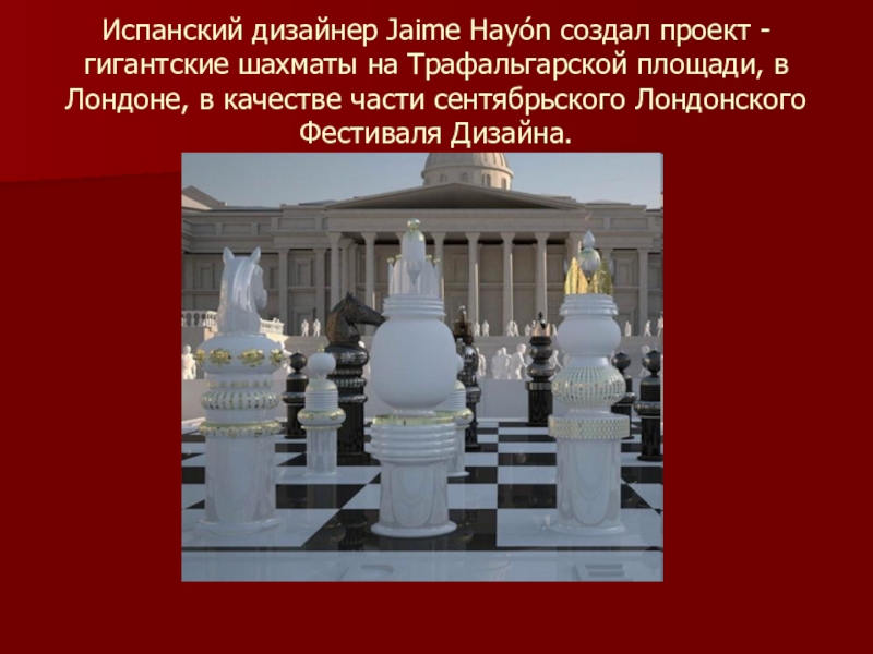 Слайд 22Испанский дизайнер Jaime Hayón создал проект - гигантские шахматы на Трафальгарской