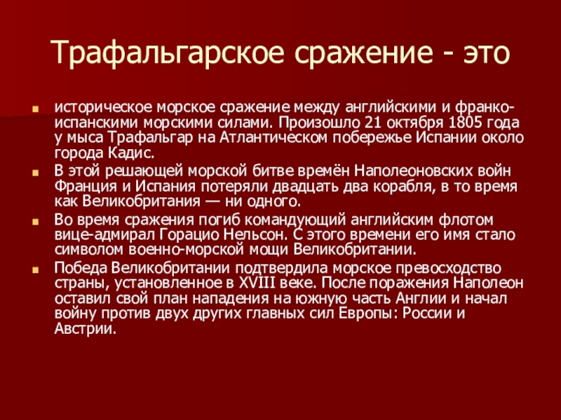 силами. Произошло 21 октября 1805 года у мыса Трафальгар на Атлантическом побережье Испании около города Кадис.