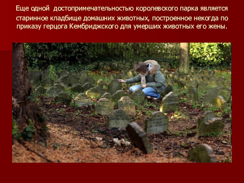 Слайд 46Еще одной достопримечательностью королевского парка является старинное кладбище домашних животных, построенное