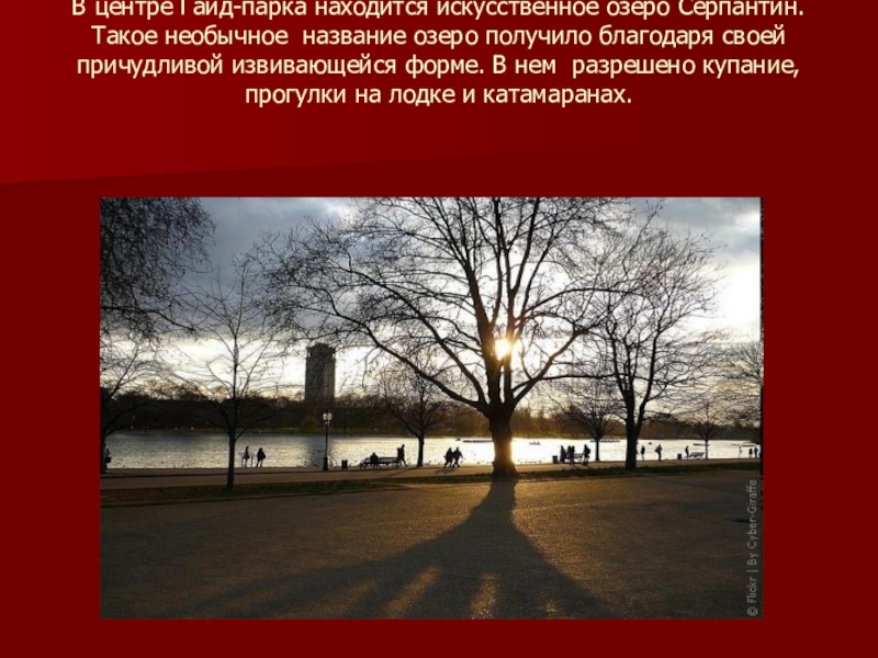Слайд 40В центре Гайд-парка находится искусственное озеро Серпантин. Такое необычное название озеро