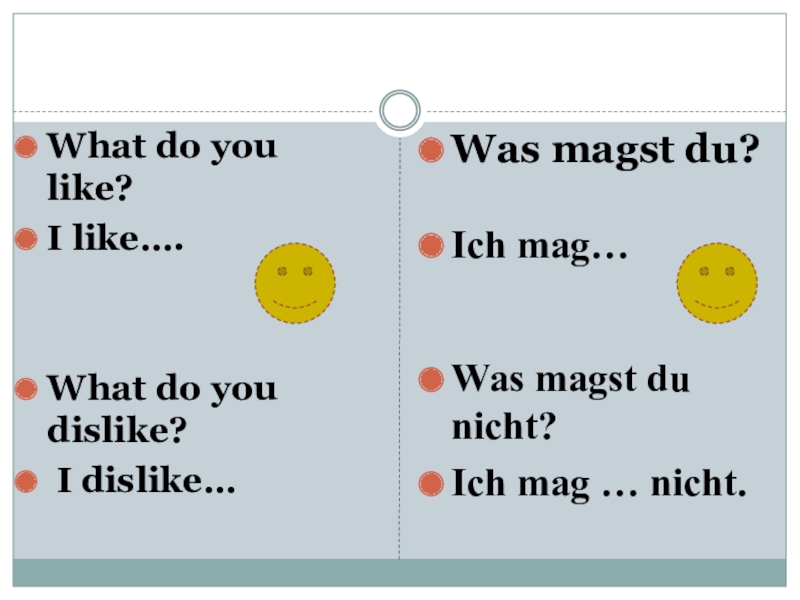 What do you like?I like….What do you dislike? I dislike… Was magst du?Ich mag…Was magst du nicht?Ich
