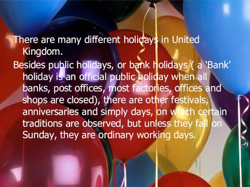 bank holidays ( a ‘Bank’ holiday is an official public holiday when all banks, post offices, most factories, offices and shops are closed), there are other festivals, anniversaries and simply days, on which certain traditions are observed, but unless they fall on Sunday, they are ordinary working days.